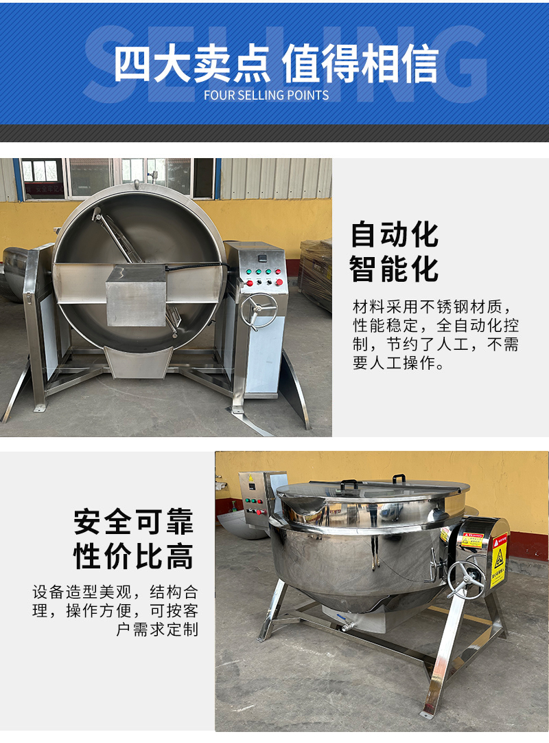 夹层锅采用了,夹层锅具有受热面积大、热效率高、加热均匀、液料沸腾时间短、加热温度容易控制等特点。